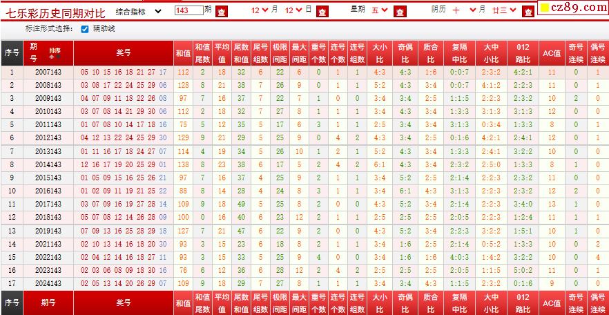 > 143期七乐彩历史同期对比图